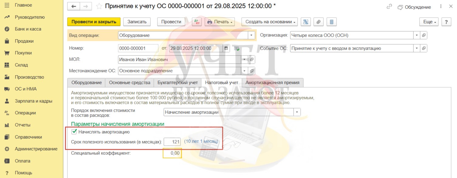 На вкладке «Налоговый учёт» для ежемесячного включения в расходы амортизационных сумм должен быть установлен флаг «Начислять амортизацию». Очень важно корректно заполнить поле «Срок полезного использования (в месяцах)» в соответствии с выбранной амортизационной группой. Так, для шестой группы (свыше 10 лет до 15 включительно) минимальный срок составляет 121 месяц.