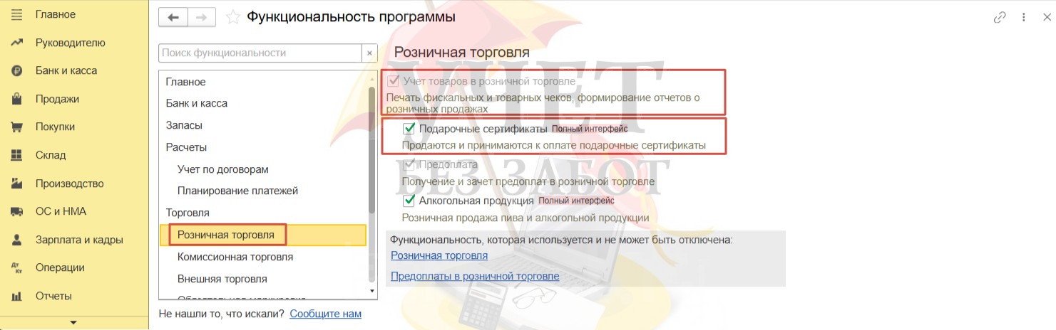 Перейдём в раздел меню «Главное» и выберем пункт «Функциональность». Для отражения операций в розничной торговле с применением подарочных сертификатов в программе 1С: Бухгалтерия предприятия ред. 3.0 на вкладке «Торговля» - «Розничная торговля» должен быть установлен флаг «Учет товаров в розничной торговле» и «Подарочные сертификаты».