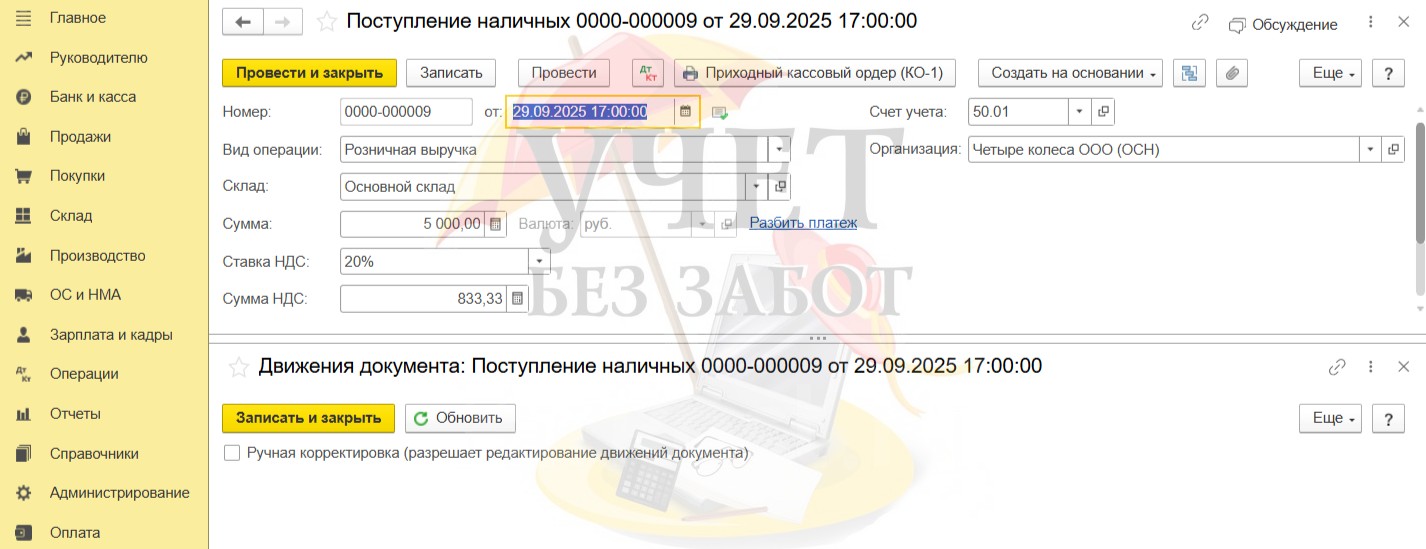 Для завершения документального оформления зарегистрируем документ «Поступление наличных» в программе на основании отчета о розничных продажах.