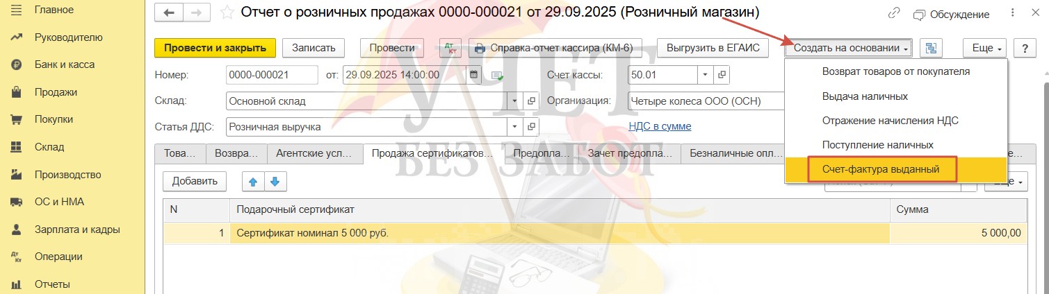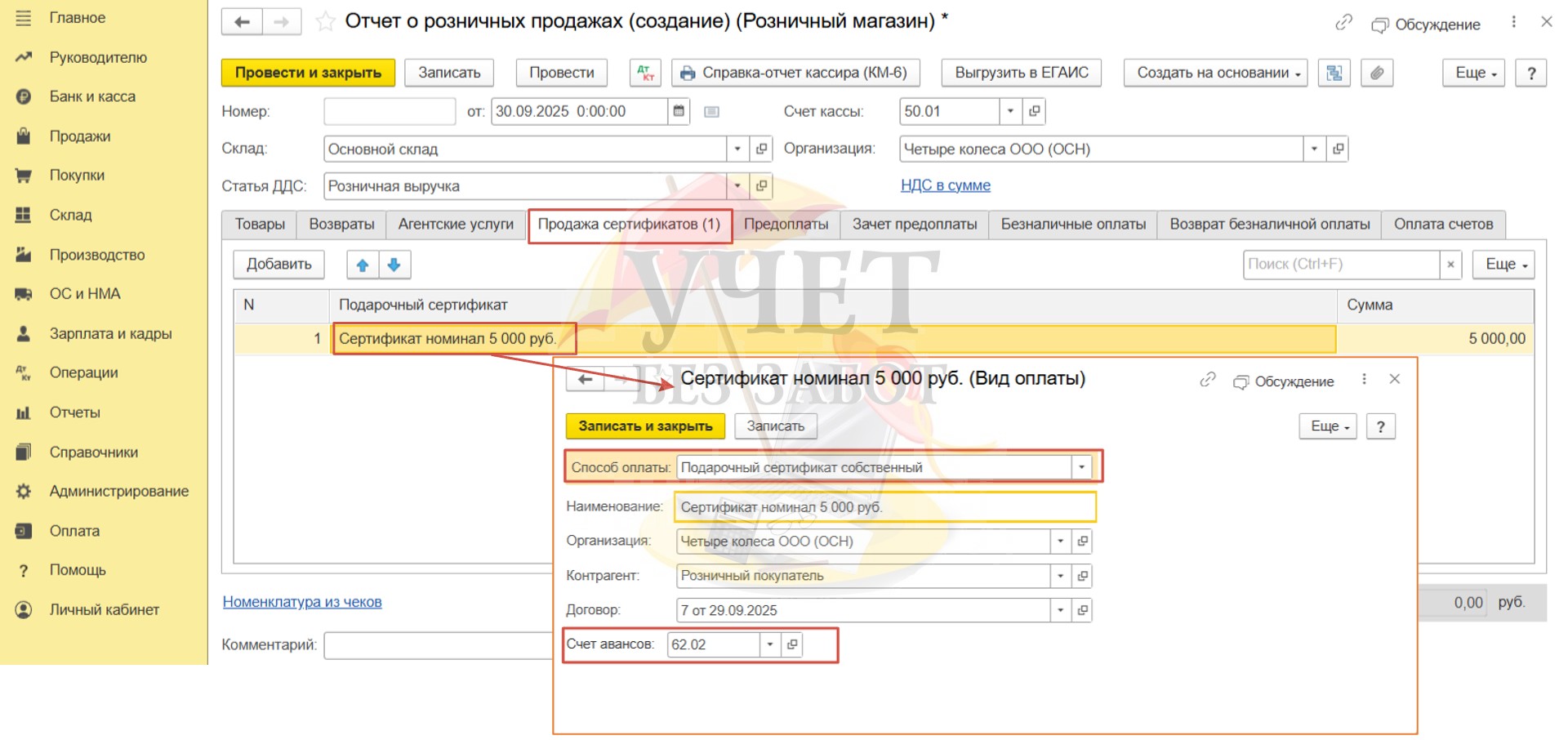 Алгоритм действий при продаже подарочных сертификатов в розничной торговле при ОСН в 1С: Бухгалтерии предприятия ред. 3.0