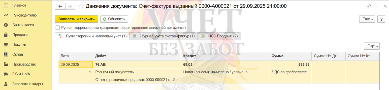 При формировании документа формируется проводка Дт 76.АВ Кт 68.02 на сумму НДС, исчисленного по предоплате.