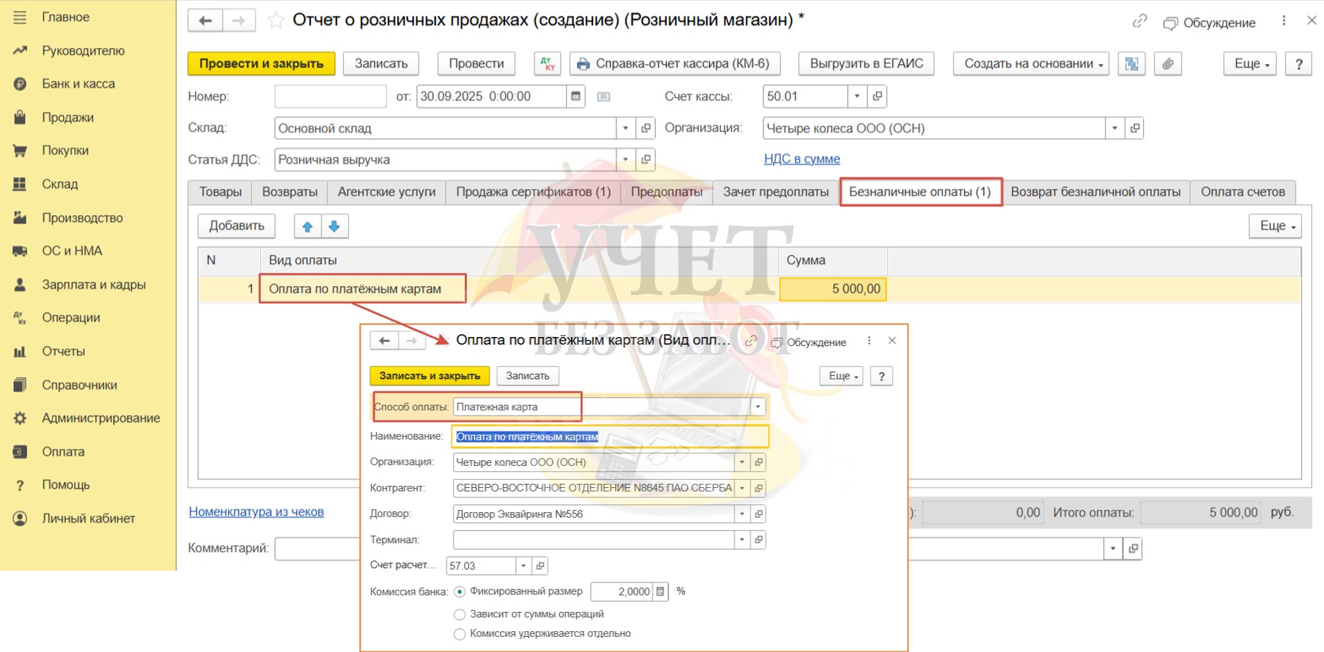 Для отражения факта оплаты платёжной картой перейдём на вкладку «Безналичные оплаты» и добавим вид оплаты с видом «Платежная карта».