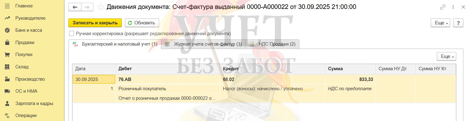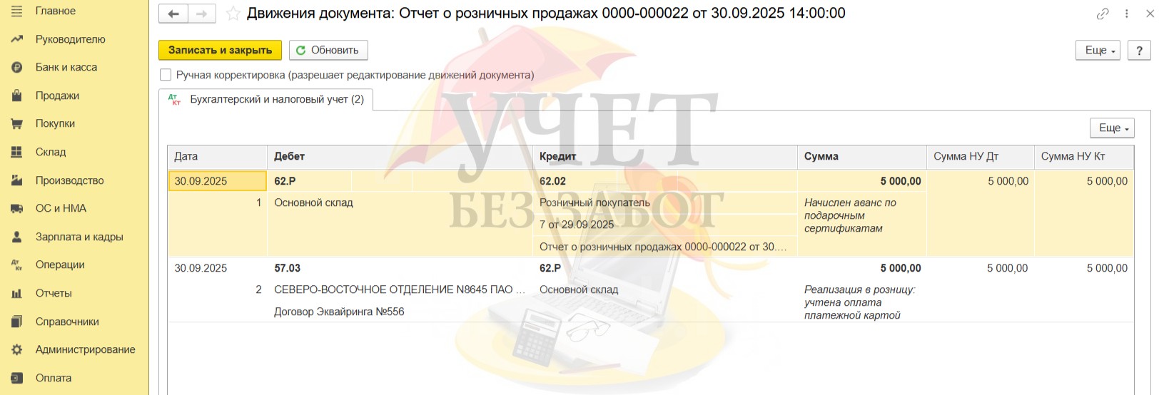 При этом проводка в Дебет счета 50.01 была сформирована при проведении отчета о розничных продажах, поэтому на этом этапе программа не регистрирует движений по проводкам.