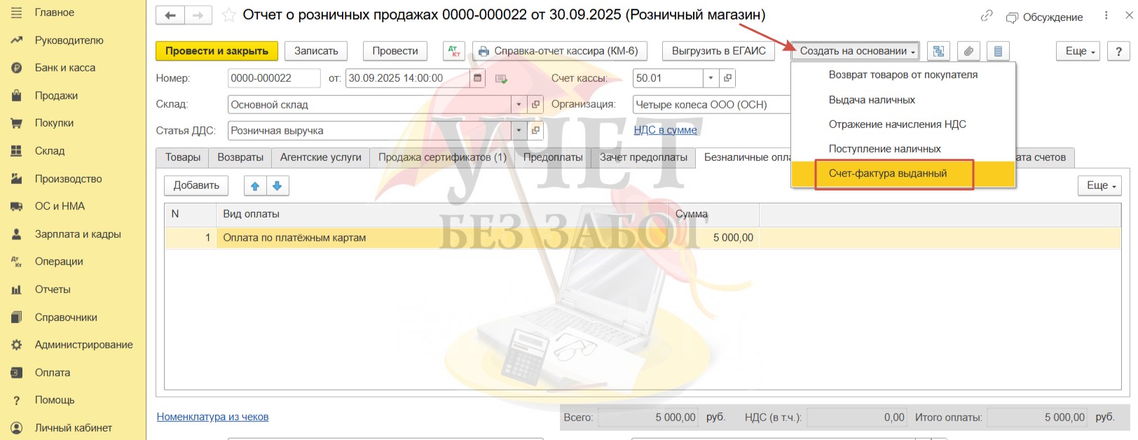 Перейдем на вкладку «Продажа сертификатов» и снова добавим вид оплаты «Сертификат номинал 5 000 руб.», который мы создавали ранее (Шаг 4). Укажем сумму продажи.