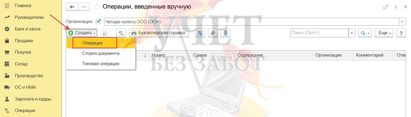 Перейдем в раздел меню «Операции» - «Операции, введённые вручную». Нажмём на кнопку «Создать» и выберем пункт «Операция».
