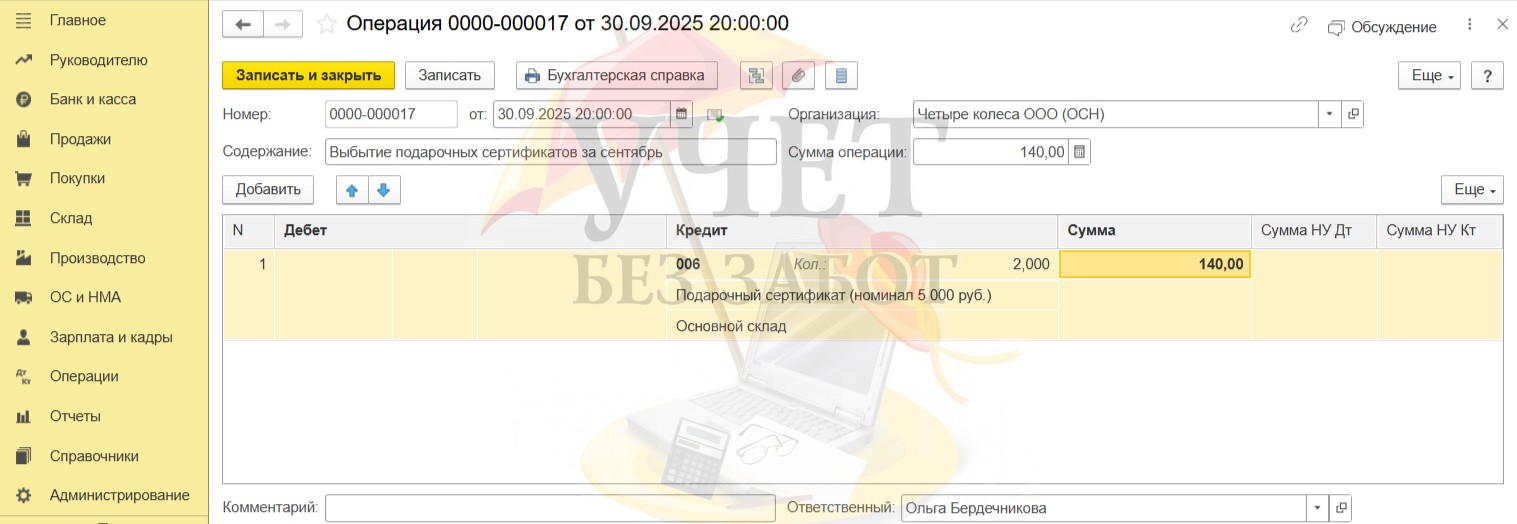 По Дебету будем использовать забалансовый счет 006 «Бланки строгой отчетности». Для детализации информации в качестве субконто запишем новый элемент «Подарочный сертификат (номинал 5 000 руб.)» в справочнике «Бланки строгой отчетности» и ниже выберем склад. Укажем количество приобретённых сертификатов и их стоимость без учёта НДС. Для сохранения данных в программе нажмём «Записать и закрыть».