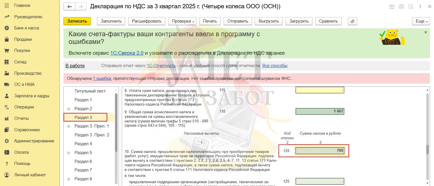 Сформируем в разделе «Отчеты» - «Регламентированные отчеты» декларацию по НДС за 3 квартал. Сумма аванса, полученного в форме наличной и безналичной оплаты, а также НДС, исчисленный с указанных сумм, отражаются по строке 070 раздела 3.