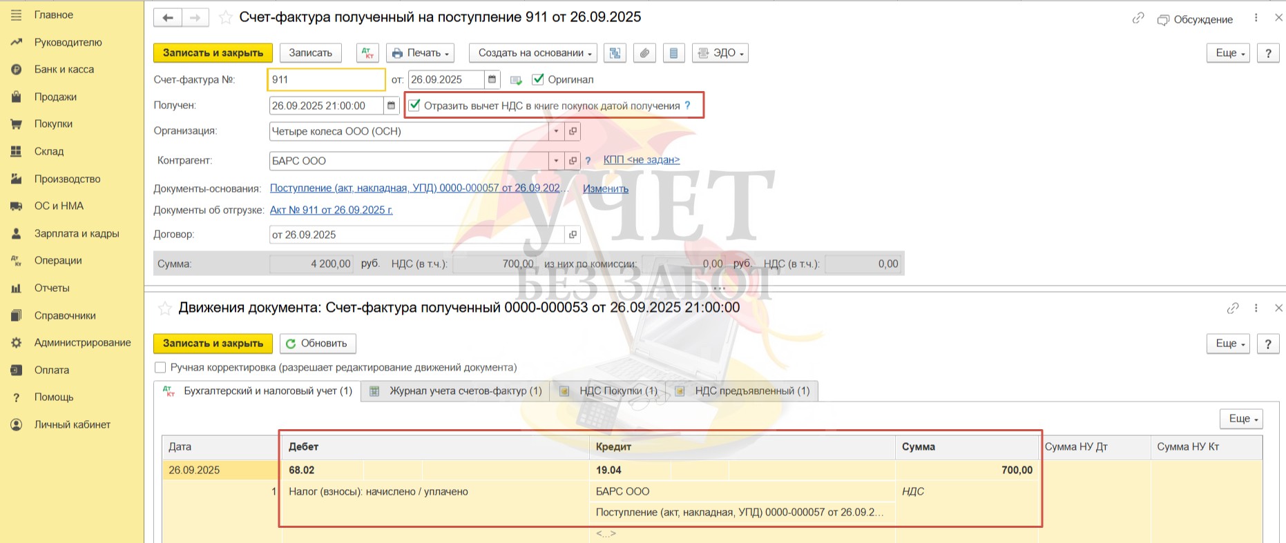26.09.2025 – организация получила от поставщика сертификаты в количестве 50 штук; ООО «БАРС» представил закрывающие документы на сумму 4 200 руб. (в т.ч. НДС – 700 руб.);