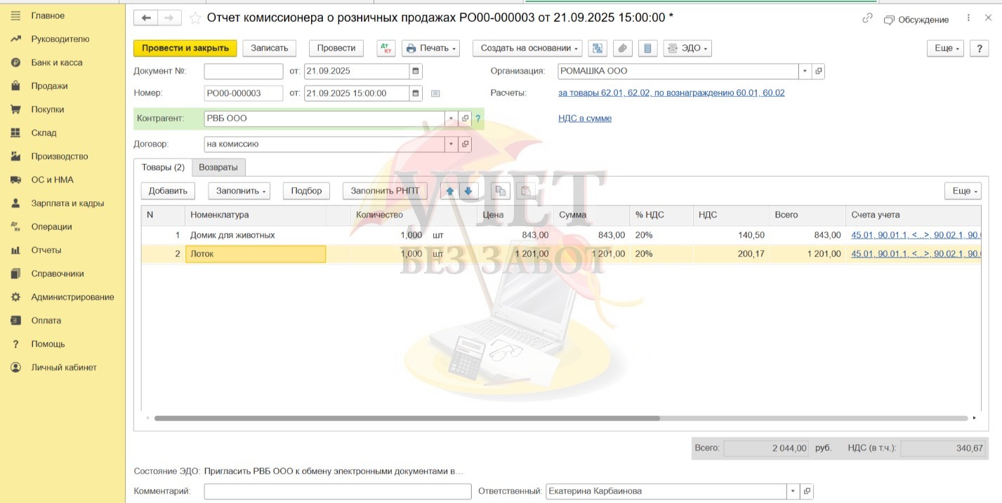 Обязательно должна быть установлена галочка «Оплата через платежного агента (комиссионера)». В этом случае сумма задолженности с юр. лица будет перенесена на РВБ. Это и правильно, т.к. оплату мы получим от РВБ.