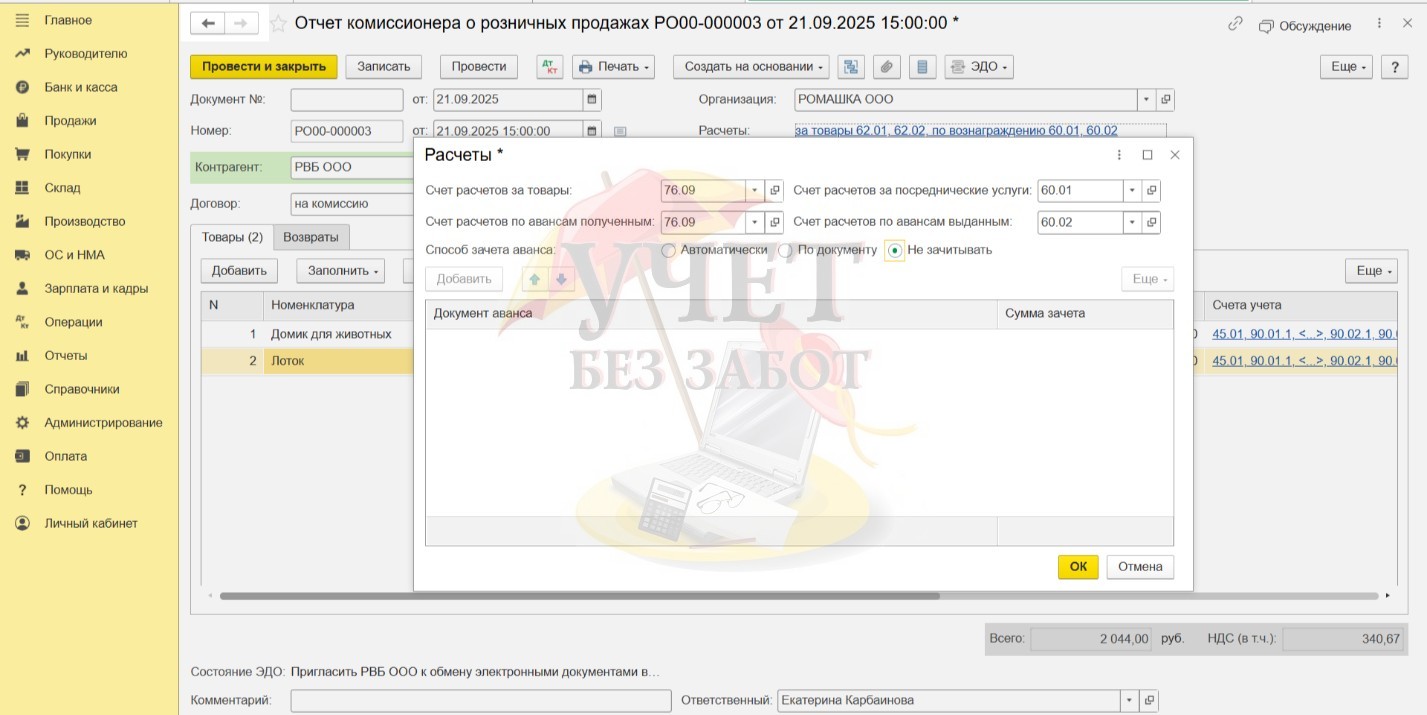 В расчетах сама реализация проходит у нас по 62 счету с покупателем, а расчеты с маркетом – на 76.09. Зачет авансов выбираем «Не зачитывать»: