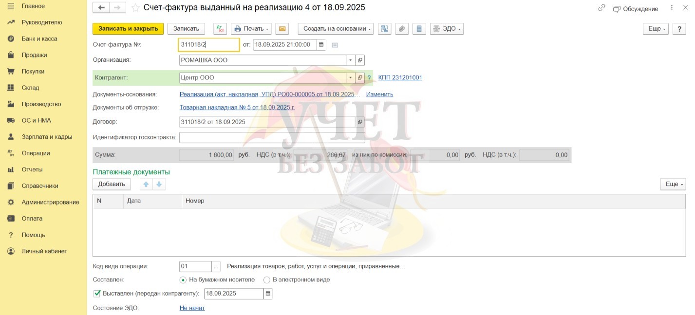 Сдвигаем бегунок УПД, т.к. при работе с НДС необходимо выставить счет-фактуру на продажу. А если вы получили УПД со статусом 1 от РВБ, то в реализации и счете-фактуре нужно указать номер полученного УПД: