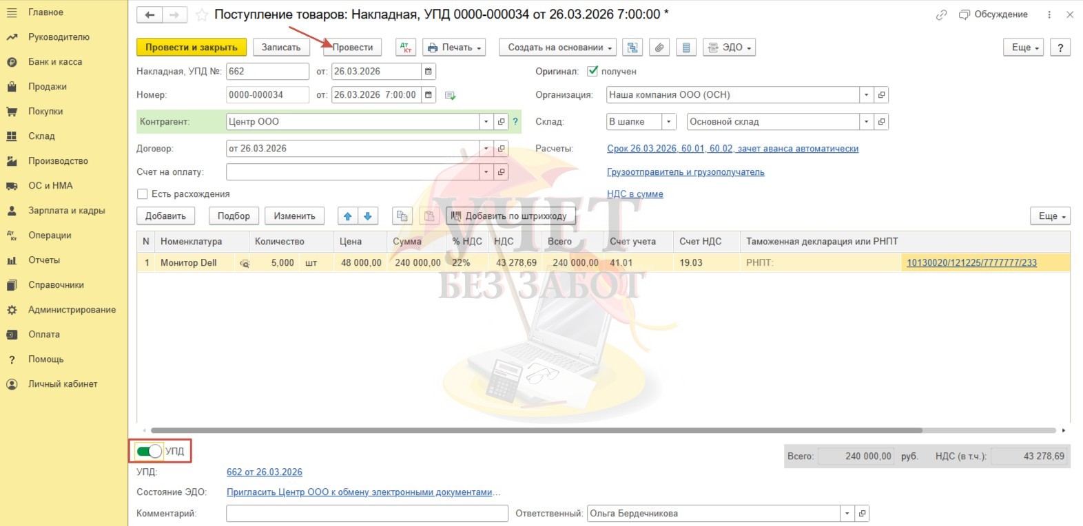 Взведем флаг «УПД» в подвале документа и проведем документ.