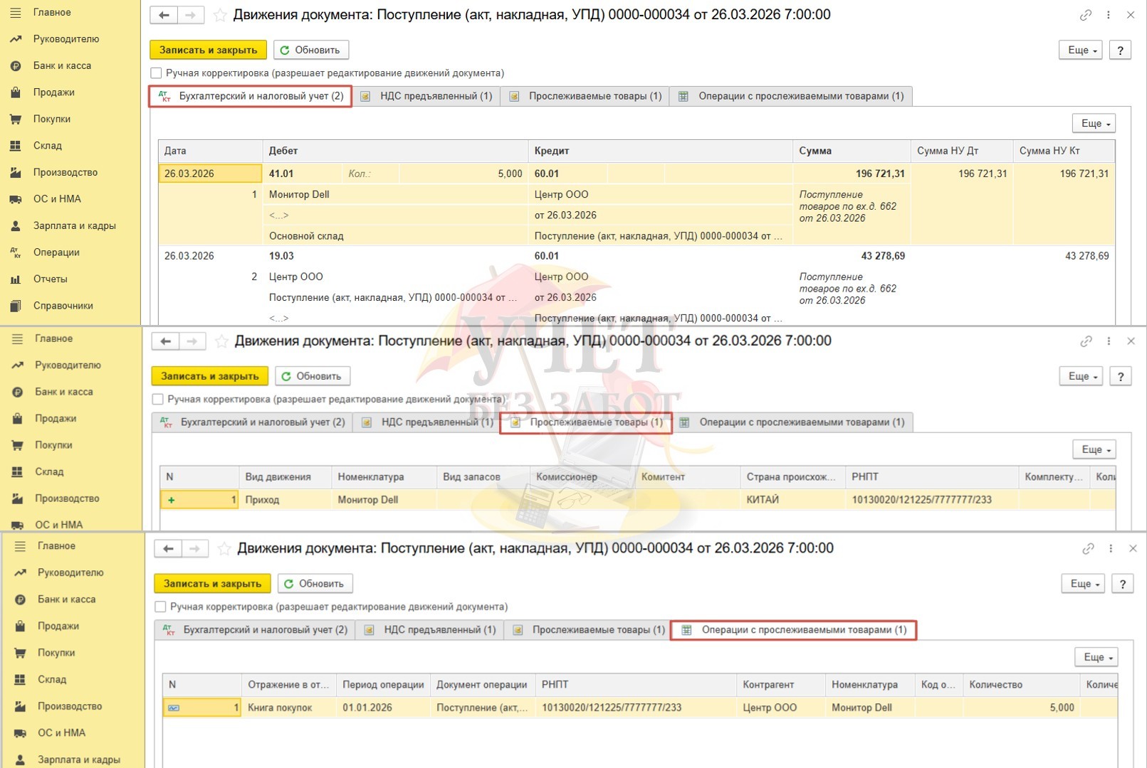 При проведении документа формируются проводки не только по бухгалтерскому учету, но и по специальным регистрам, в которых отражается информация по поступившим прослеживаемым товарам.