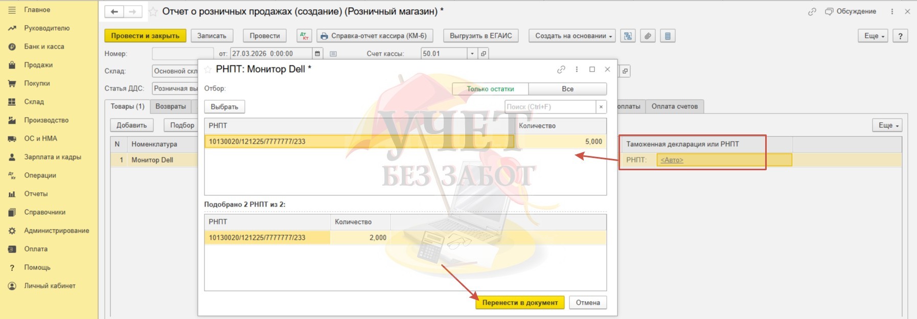 На текущий момент колонка «Таможенная декларация или РНПТ» имеет значение «Авто». Это означает, что программа сама произведет подбор РНПТ для товара. Принцип такого механизма подбора состоит в том, что программа будет выбирать РНПТ в соответствии с хронологией поступления товаров.
