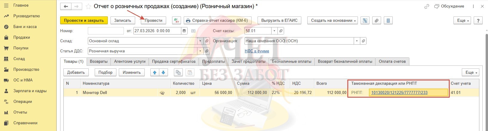 В поле «Таможенная декларация или РНПТ» обязательно укажите РНПТ в соответствии с документами поставщика. Без этого программа не позволит провести документ.