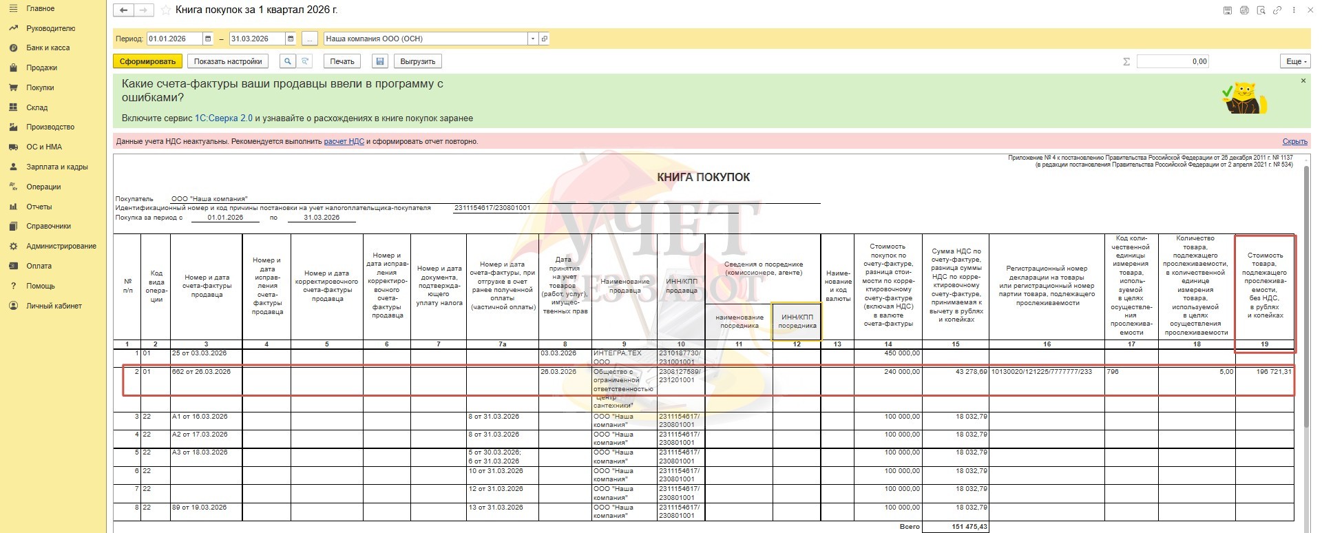 Данные о приобретенных прослеживаемых товарах будут автоматически отражены в книге покупок без каких-либо дополнительных действий в программе. Давайте в этом убедимся и сформируем книгу покупок в разделе «Отчеты» - «Книга покупок».