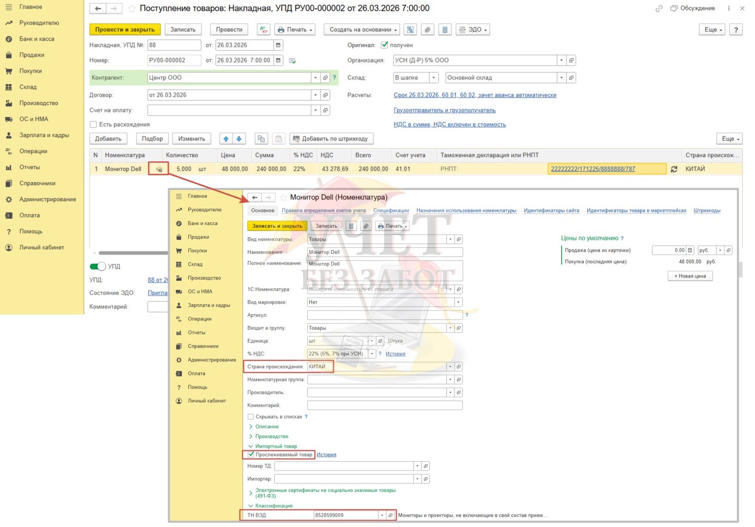В разделе меню «Покупки» - «Поступление (акты, накладные, УПД)» зарегистрируем документ с видом «Товары (накладная, УПД)». При заполнении карточки номенклатуры очень важно указать страну происхождения. После этого в подразделе «Импортный товар» нужно установить флаг «Прослеживаемый товар», а в поле «ТН ВЭД» выбрать нужный код из справочника. Если вы заполнили карточку таким образом, рядом с указанием номенклатуры отобразиться специальный значок в виде лупы.