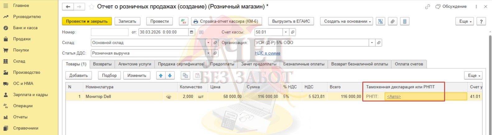 Перейдем в раздел меню «Продажи» - «Отчеты о розничных продажах» и создадим новый документ с видом «Розничный магазин». В табличной части выберем нужную номенклатуру, укажем количество и цену. Программа автоматически подберет РНПТ в документ, используя метод ФИФО. При необходимости РНПТ можно изменить вручную.