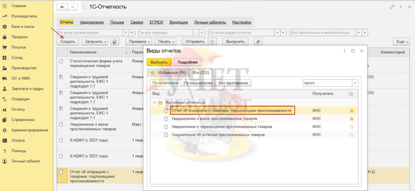 Перейдем в раздел меню «Отчеты» - «Регламентированные отчеты» и создадим отчет об операциях с товарами, подлежащими прослеживаемости.
