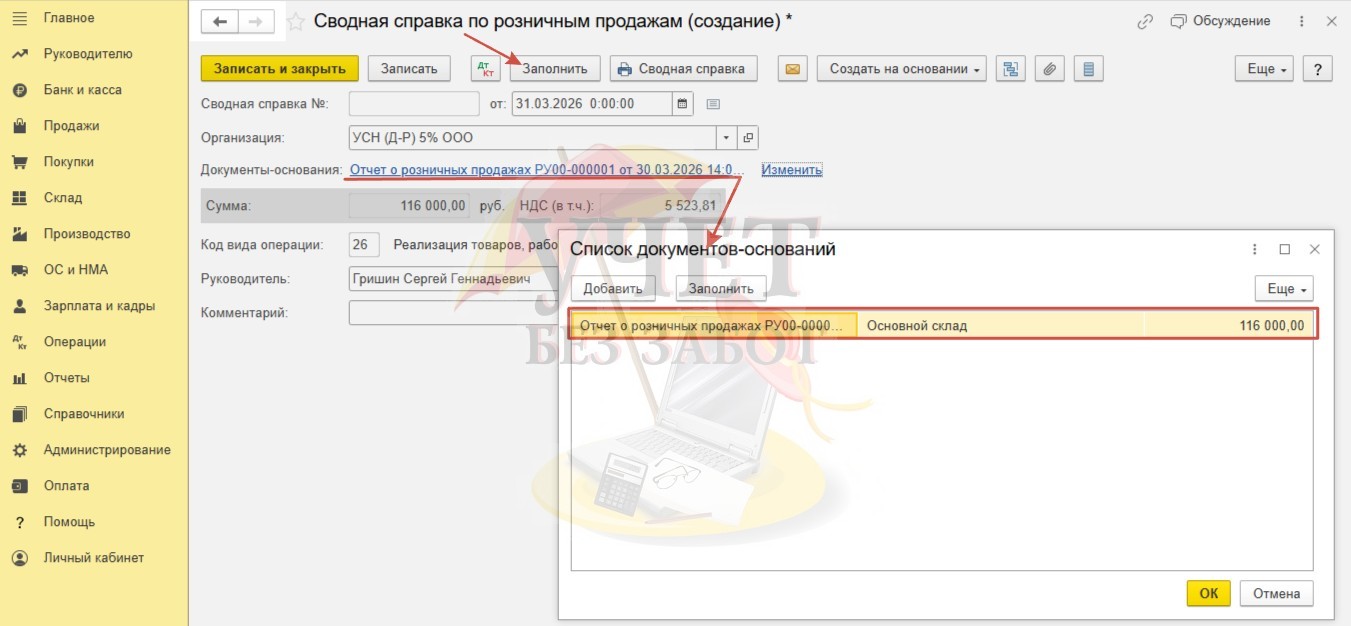 После нажатия на кнопку «Заполнить», в справку попадут все проведенные отчеты о розничных продажах за квартал.