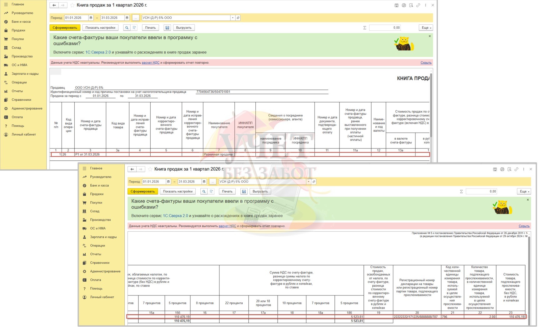 Теперь сформируем книгу продаж в разделе меню «Отчеты» - «Книга продаж». Применяя алгоритм, описанный выше, в отчете вы получите данные о продажах одной строкой. При этом, если РНПТ будет несколько, то и колонок 20-23, относящихся к одному сводному документу, также будет несколько.