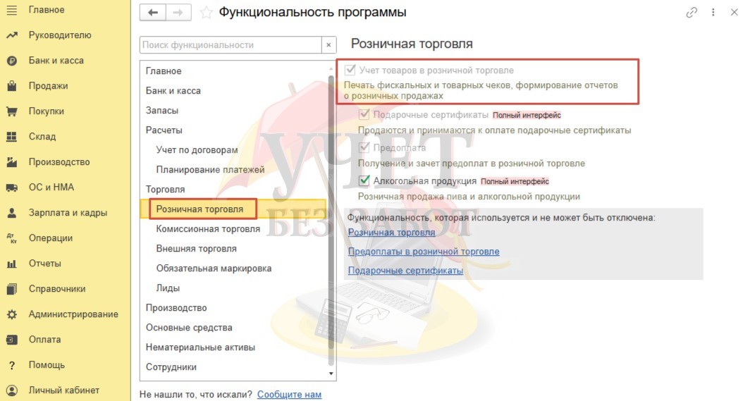 Необходимо убедиться, что у вас установлен флаг «Учет товаров в розничной торговле» на вкладке «Торговля» - «Розничная торговля»,