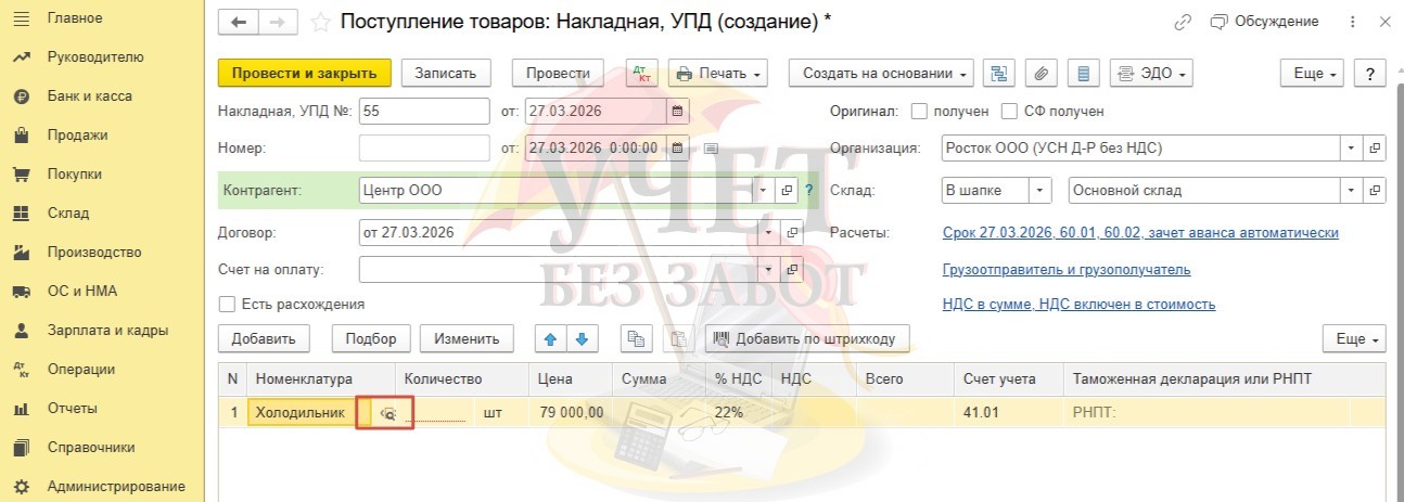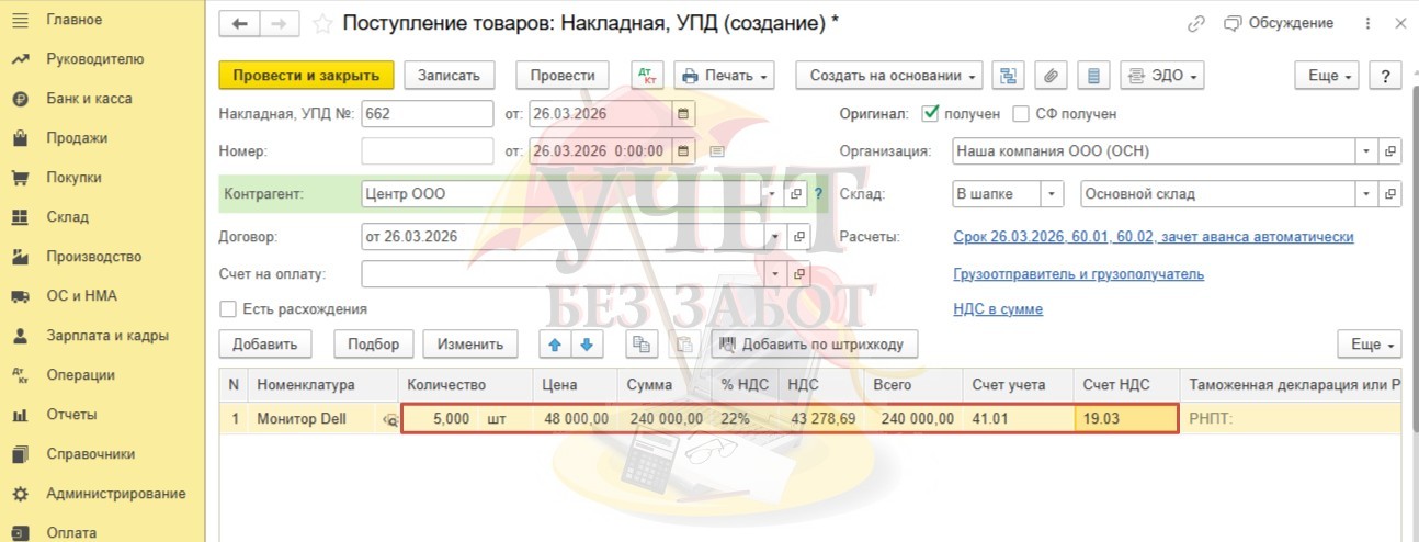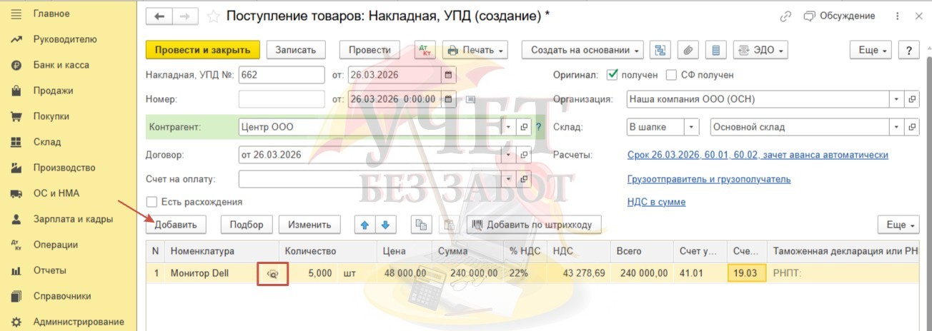 Вернемся в документ, укажем количество и цену. Будем использовать счет учета товаров 41.01, а для учета входящего НДС счет 19.03.