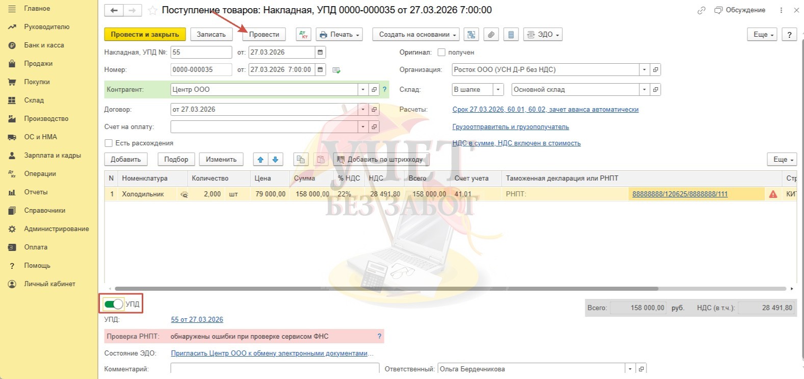 Установим флаг «УПД» и проведем документ.