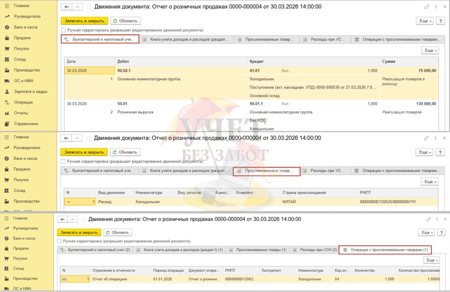 При проведении сформированы проводки по бухгалтерскому учету на сумму выручки и себестоимости. Кроме этого, сформированы записи по регистрам «Прослеживаемые товары» и «Операции с прослеживаемыми товарами», которые будут отражать факт реализации прослеживаемых товаров.