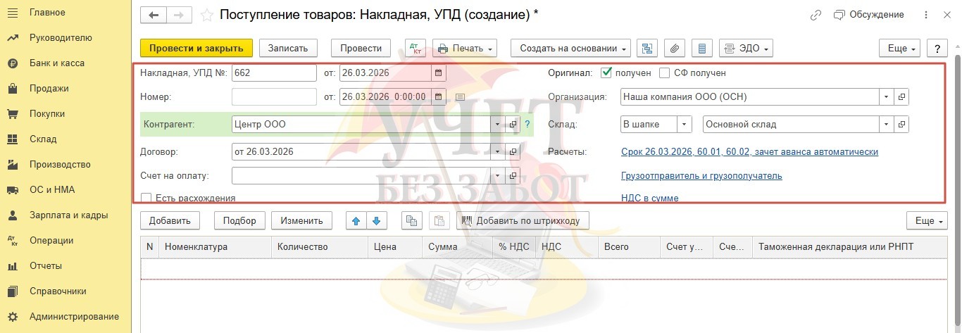 Создадим документ вида «Товары (накладная, УПД)» в разделе меню «Покупки» - «Поступление (акты, накладные, УПД)».