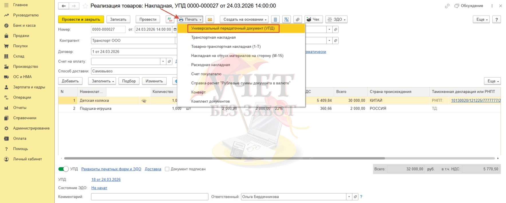 Посмотрим печатную форму сформированного программой УПД. Для этого воспользуемся кнопкой «Печать».