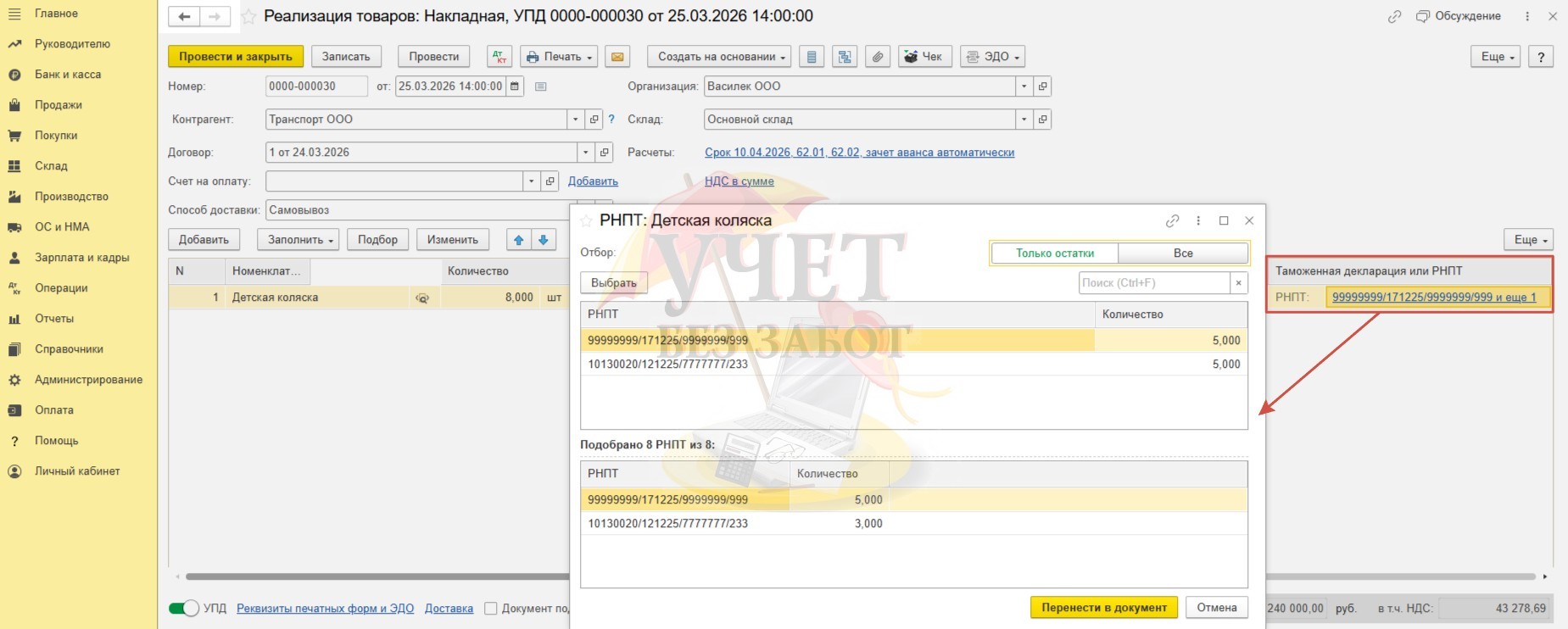 Как и в предыдущих примерах, РНПТ в графе «Таможенная декларация или РНПТ» проставится автоматически.