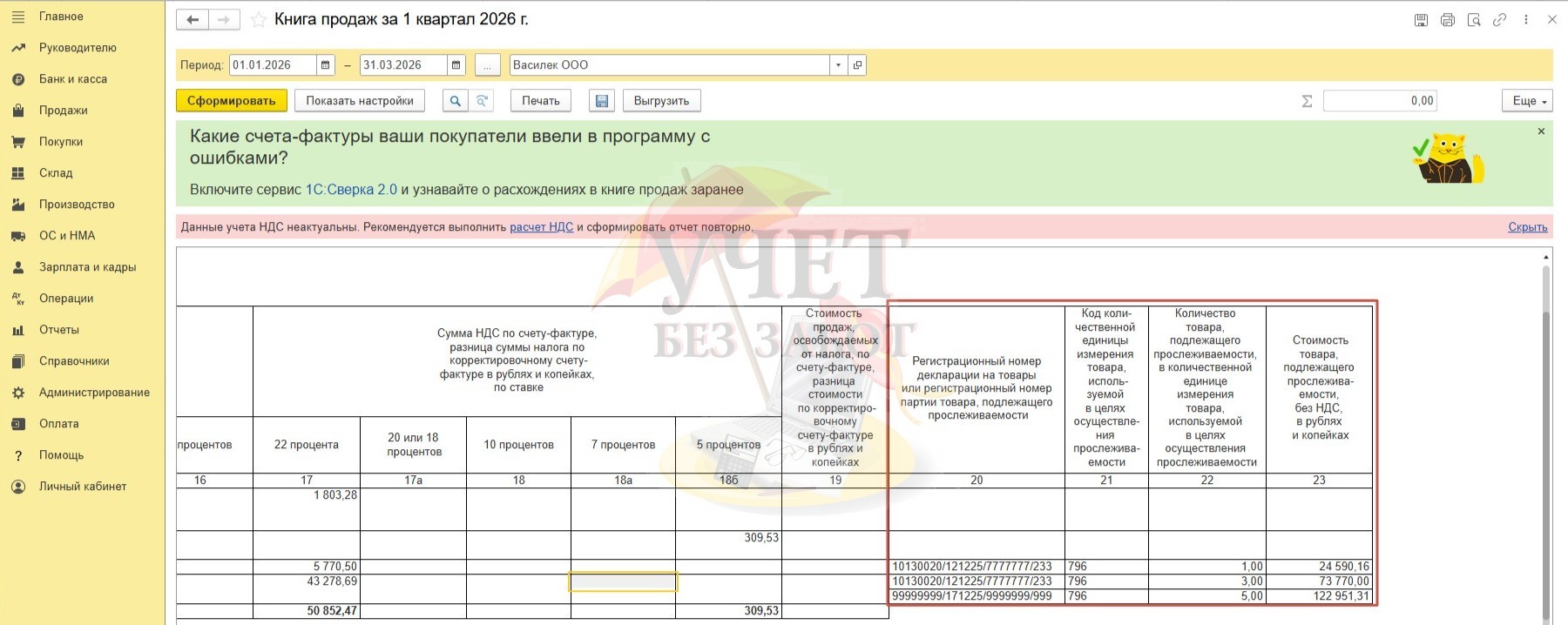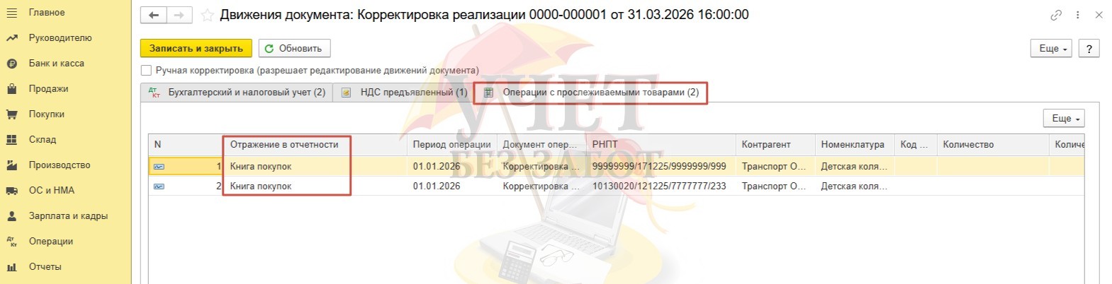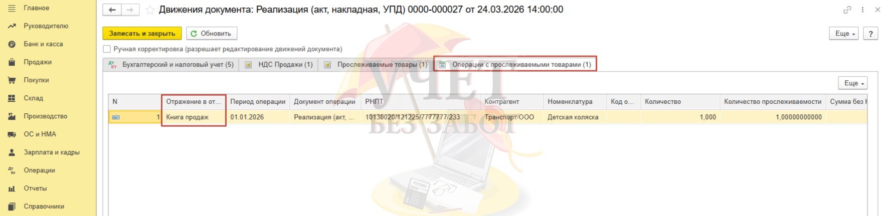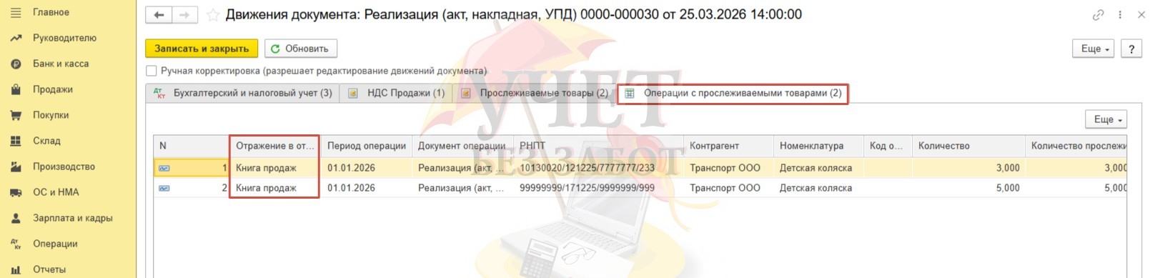 Далее перейдем к анализу регистра «Операции с прослеживаемыми товарами». Здесь нас интересует графа «Отражение в отчетности». Так как ООО «Василек» является плательщиком НДС, то данные о реализации будут отражены в книге продаж.
