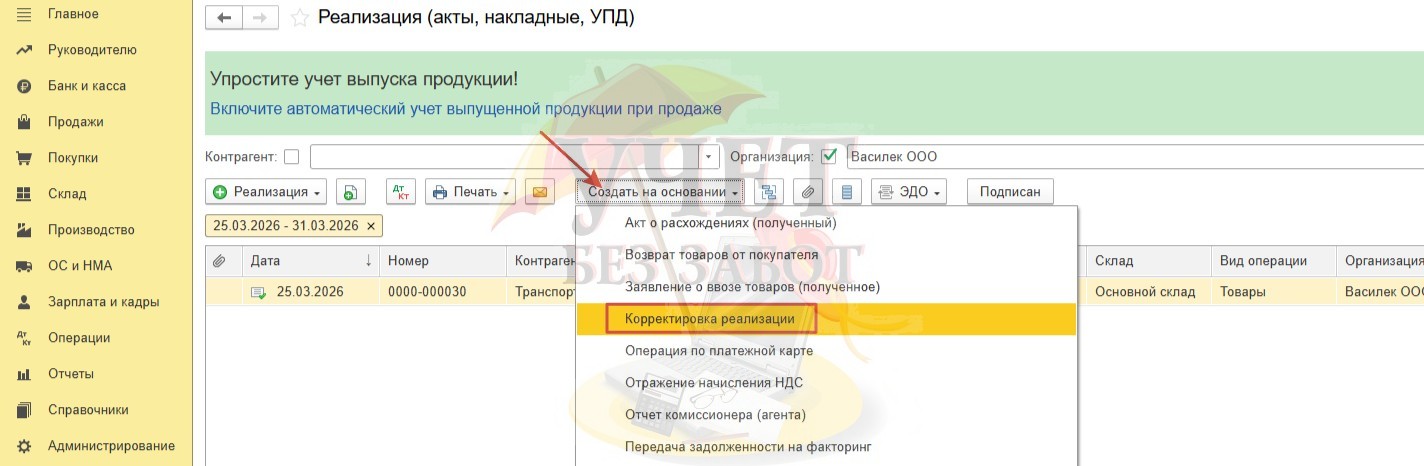 Для этого на основании документа «Реализация (акты, накладные, УПД)» создадим документ «Корректировка реализации».