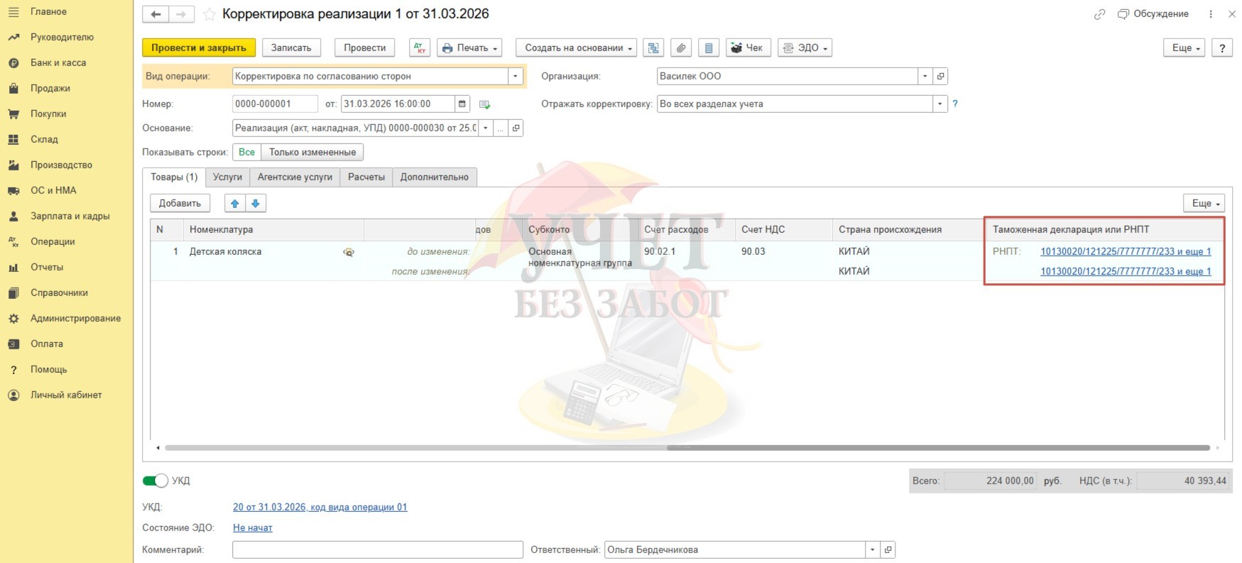 В нашем примере была произведена «Корректировка по согласованию сторон» в сторону уменьшения цены на прослеживаемый товар. То есть первоначальная цена детской коляски была 30 000 р., а после корректировки стала 28 000 р. Проведем данный документ, не забывая выписать корректировочный счет-фактуру.