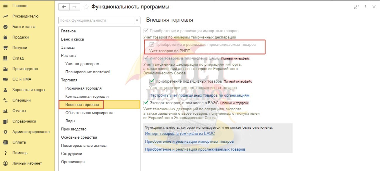 Не забудьте перед началом работы с прослеживаемыми товарами убедиться, что этот функционал включен в разделе меню «Главное» - «Функциональность» на вкладке «Внешняя торговля».