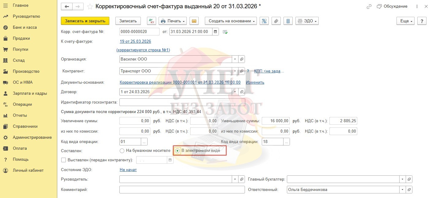 Напомним, что корректировочный счет-фактура также должен быть выставлен в электронном виде и передан покупателю через оператора ЭДО (электронный документооборот).