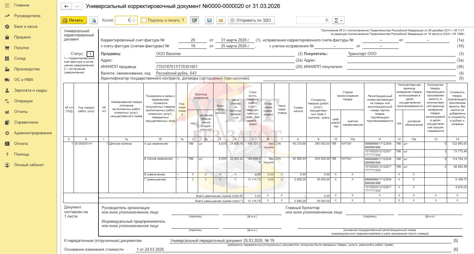 Печатная форма Универсального корректировочного документа (УКД) будет выглядеть следующим образом.