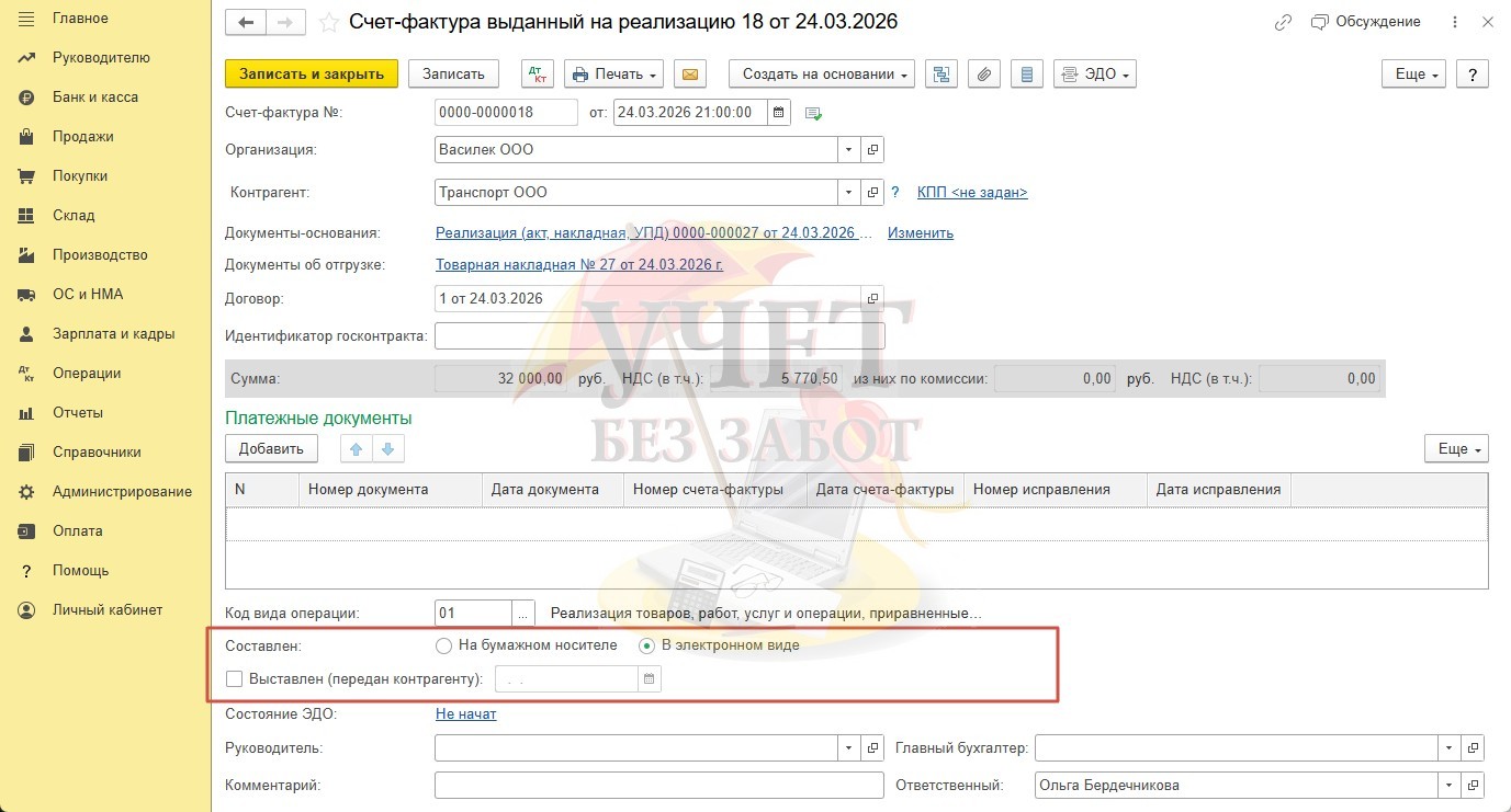 Как мы уже говорили ранее, если в реализации фигурируют прослеживаемые товары, то счет-фактура передается покупателю только в электронном виде. В таком случае, галочка «Выставлен (передан контрагенту)» не будет установлена до тех пор, пока контрагент не получит данный документ по телекоммуникационным каналам связи (ТКС).