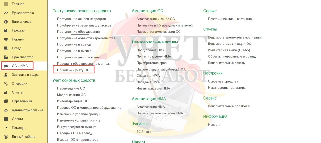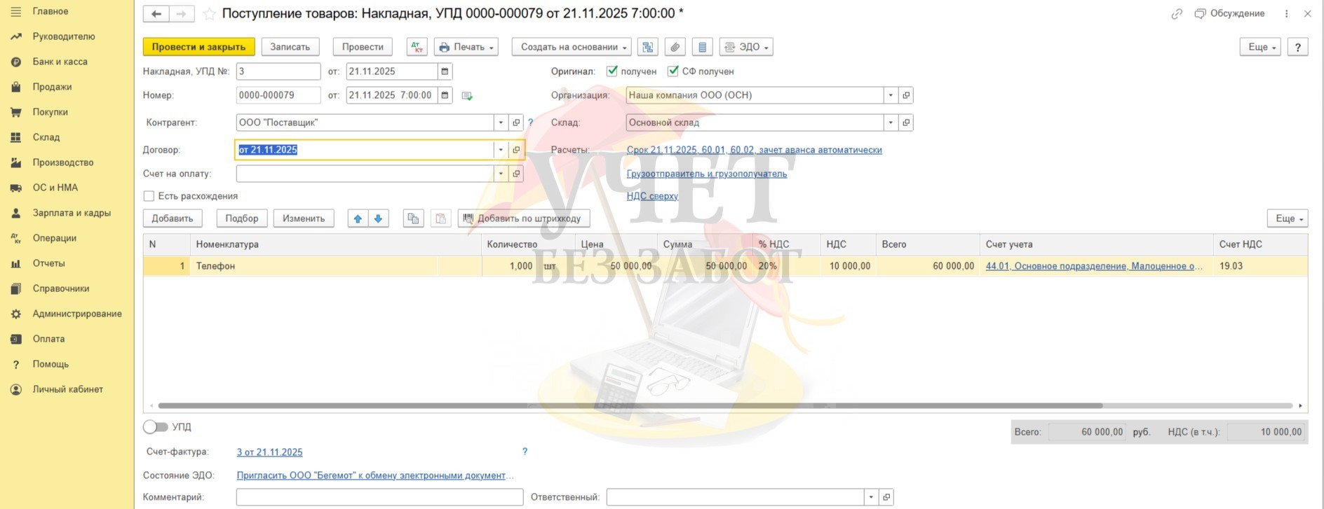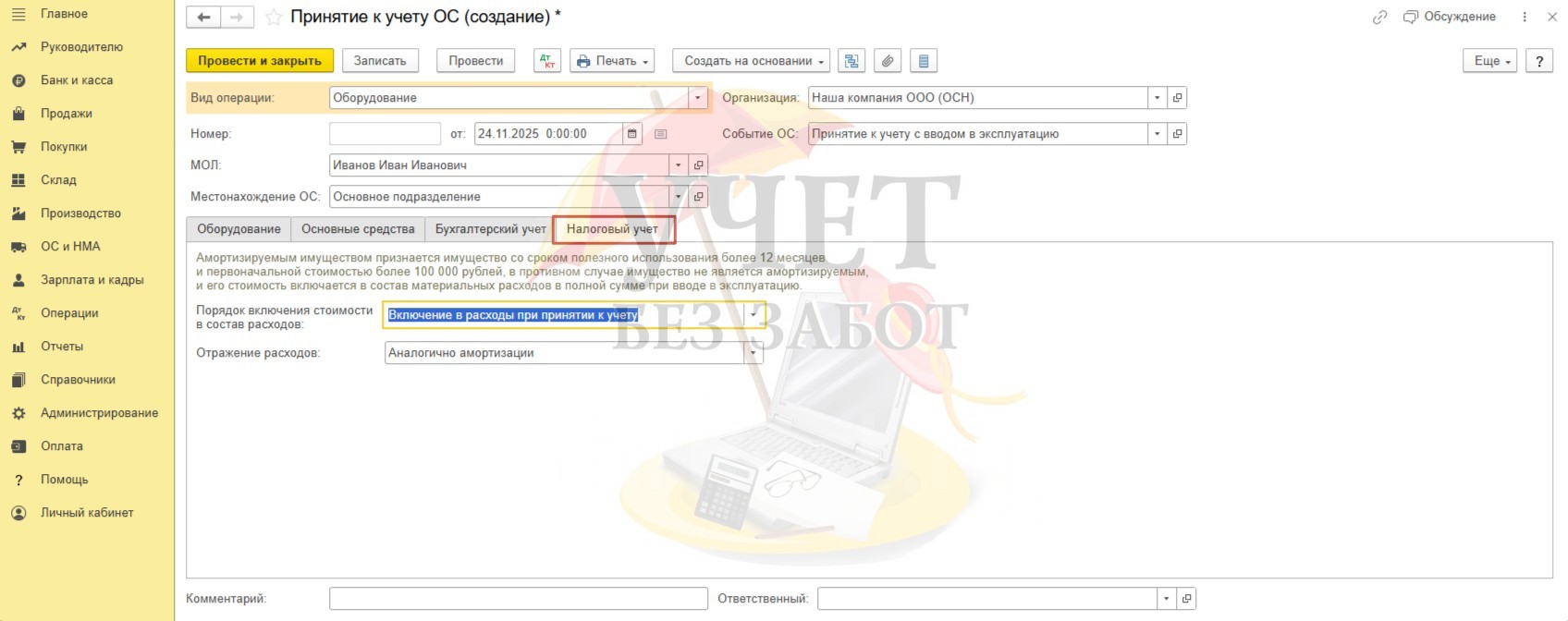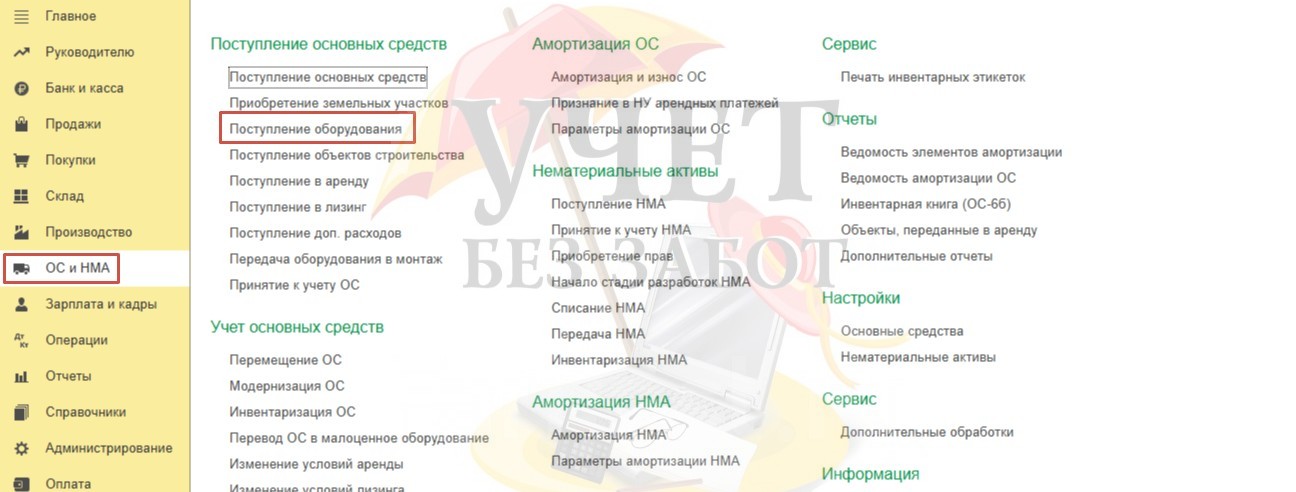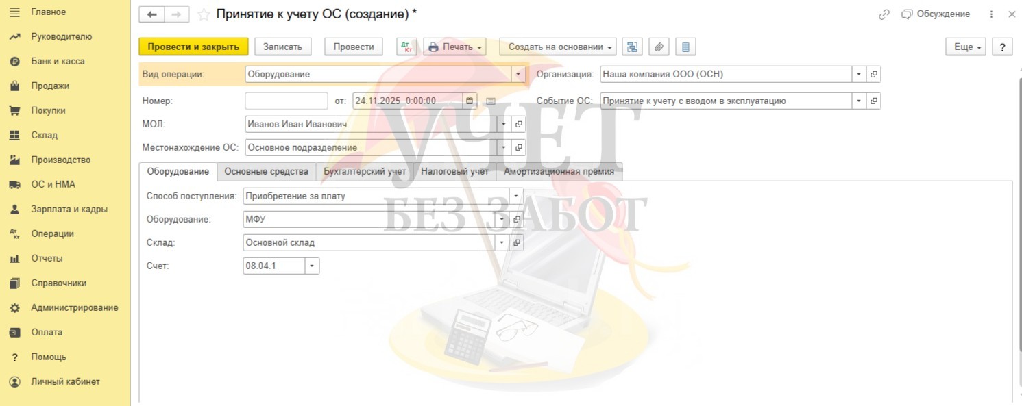 Начнем с документа «Поступление оборудования» в разделе меню «ОС и НМА».