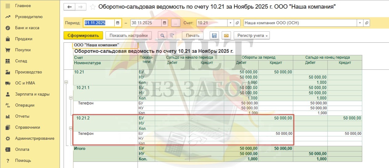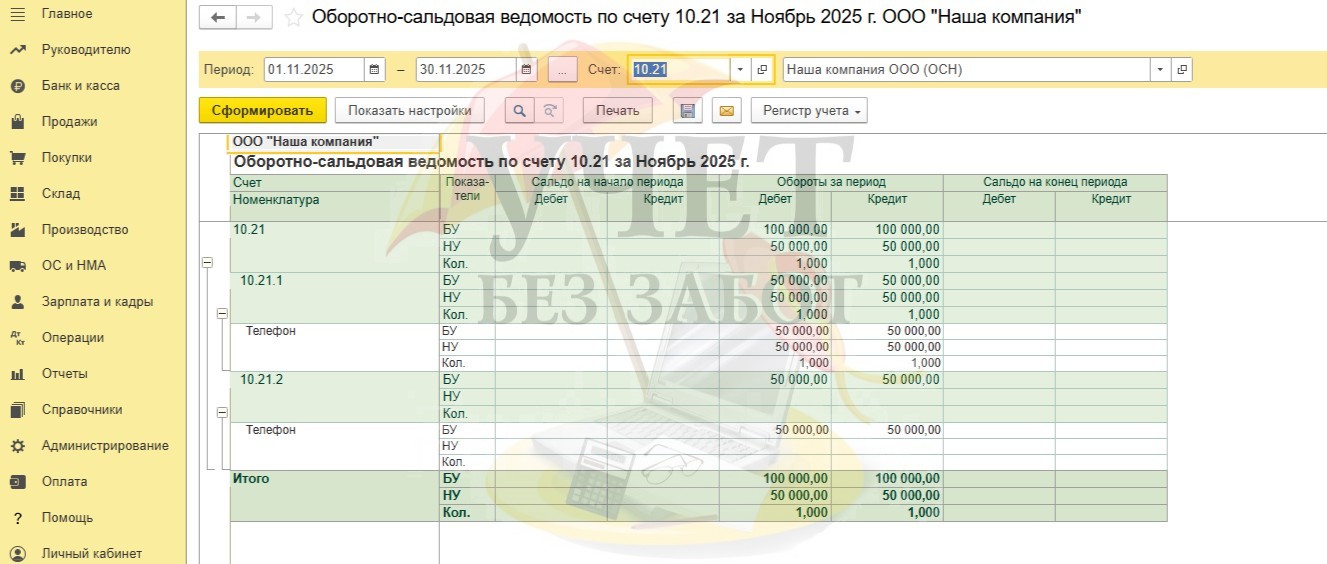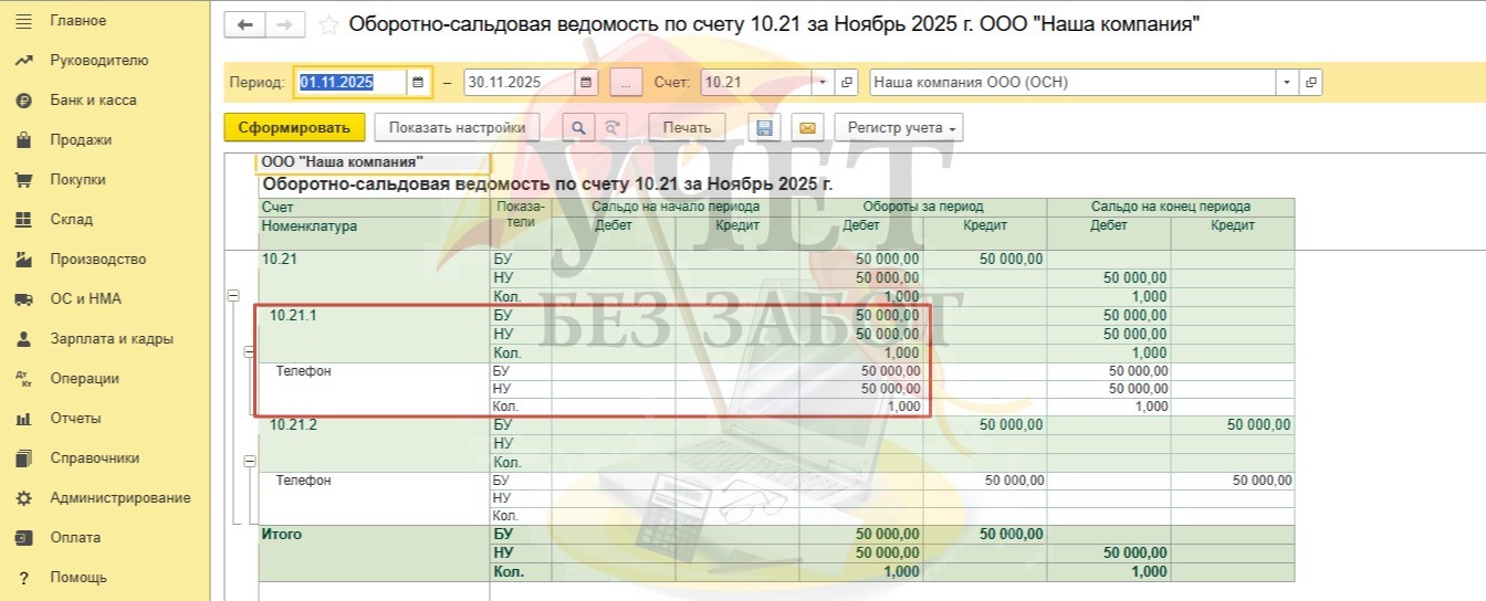 По счету 10.21.1 при оприходовании телефона стоимость отразилась как в БУ, так и в НУ, количество 1: