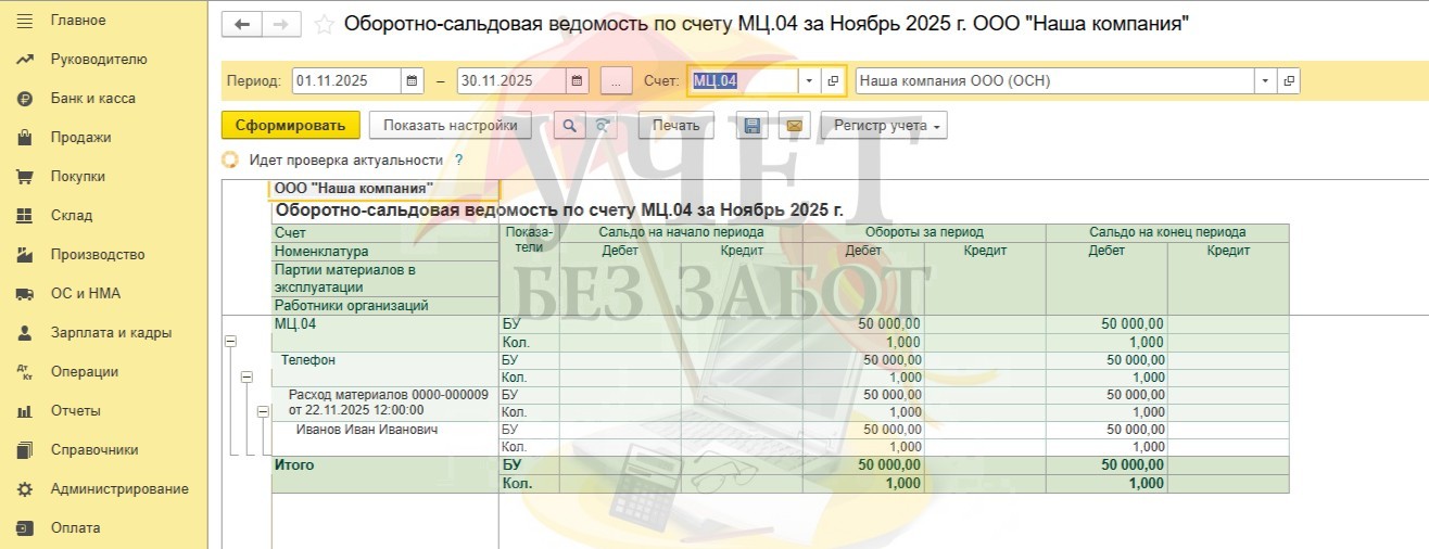 Счет МЦ.04 (забалансовый) имеет остаток, стоимость и количество; данный регистр содержит информацию об имуществе, ответственном лице, которому имущество передано и дате передачи. Регистр может использоваться при проведении инвентаризации. Списание имущества со счета произойдет в момент реального списания и утилизации имущества: