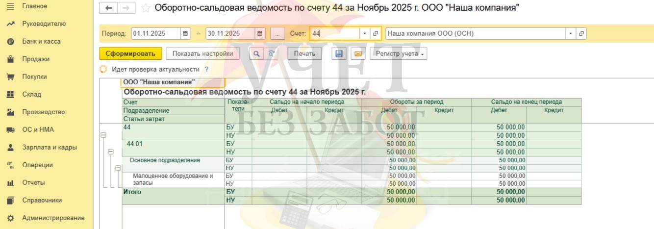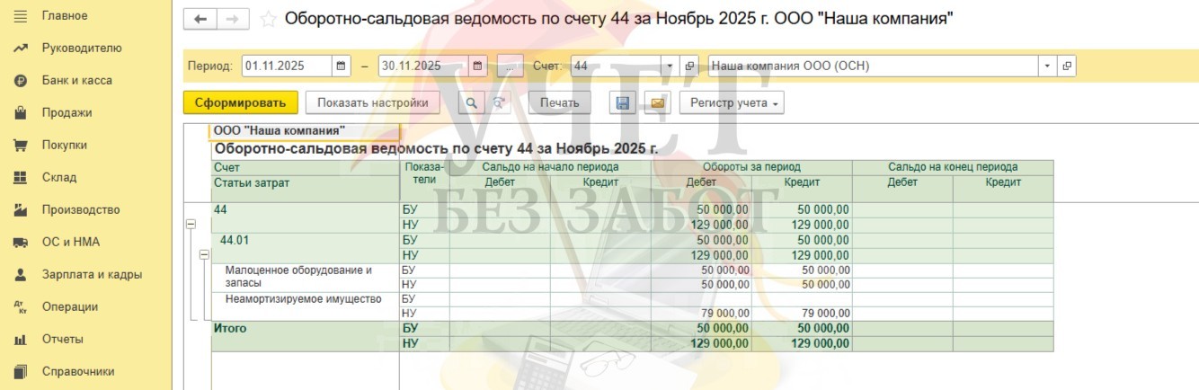 Счет 44.01 остатка не имеет, т.к. расходы ноября учтены при определении финансового результата при закрытии месяца; амортизация в качестве расходов отражена только в БУ.
