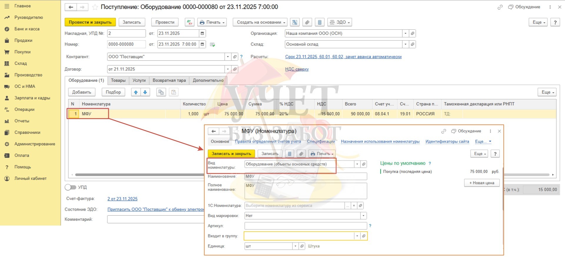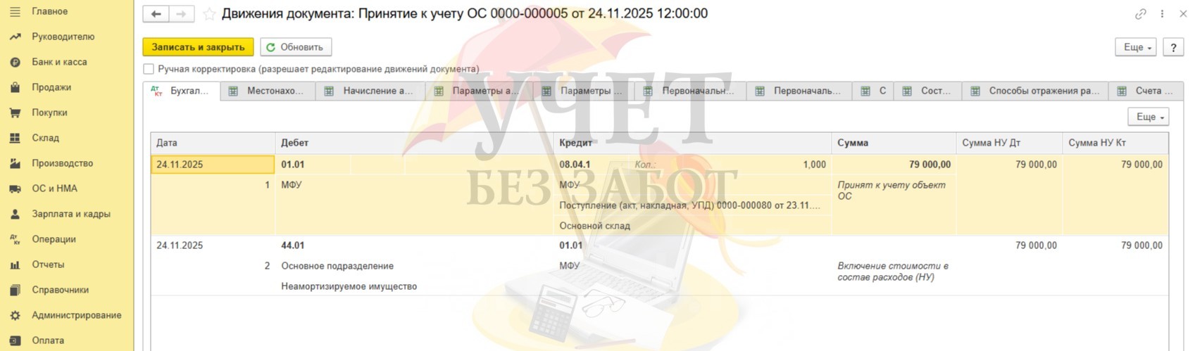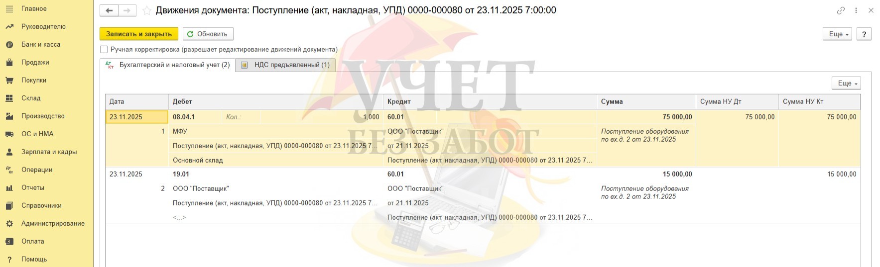23.11.2025 г. было оприходовано МФУ стоимостью 90 000 рублей (в т.ч. НДС 15 000 рублей). Т.к. срок службы имущества более 12 месяцев и стоимость выше предусмотренного учетной политикой лимита, в БУ МФУ отражается в качестве основного средства.