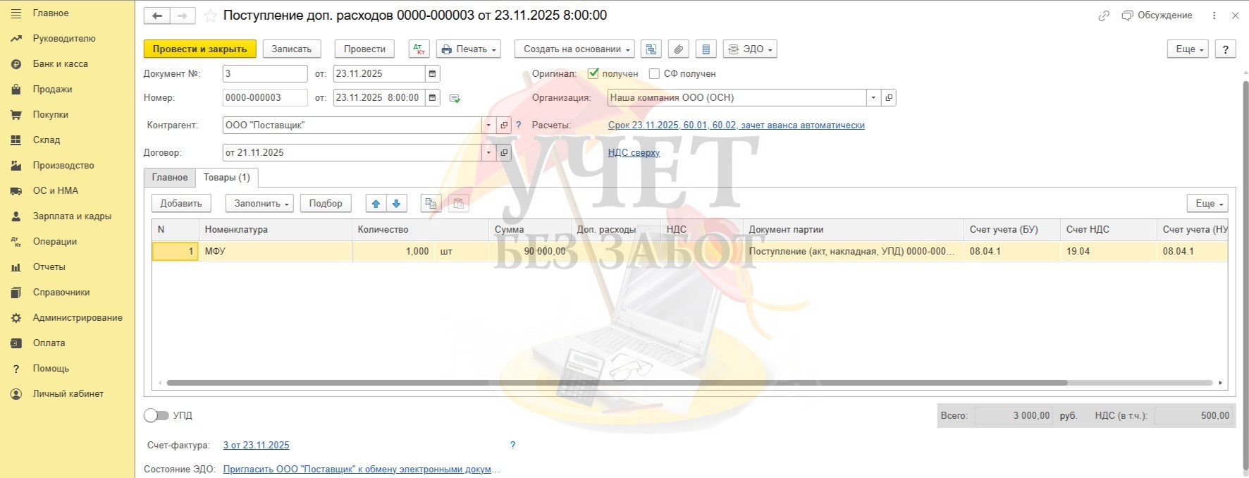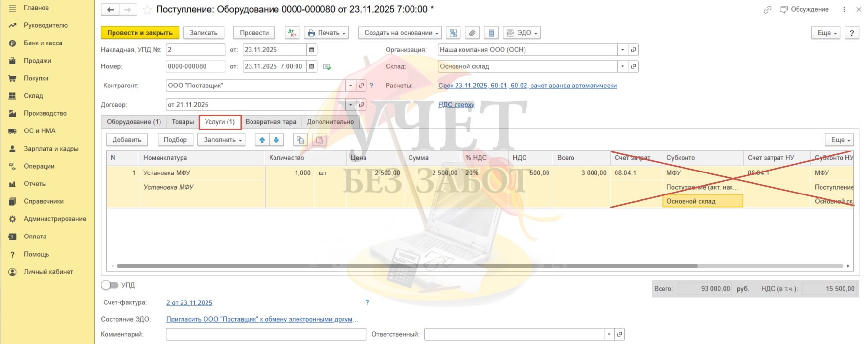 Т.к. установку МФУ осуществляла эта же компания «Поставщик», достаточно часто пользователи допускают ошибку, отражая дополнительные расходы в этом же документе на закладке «Услуги».