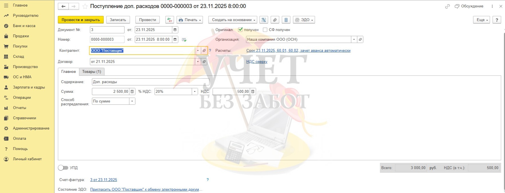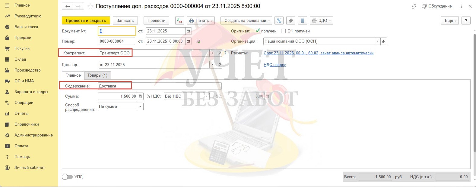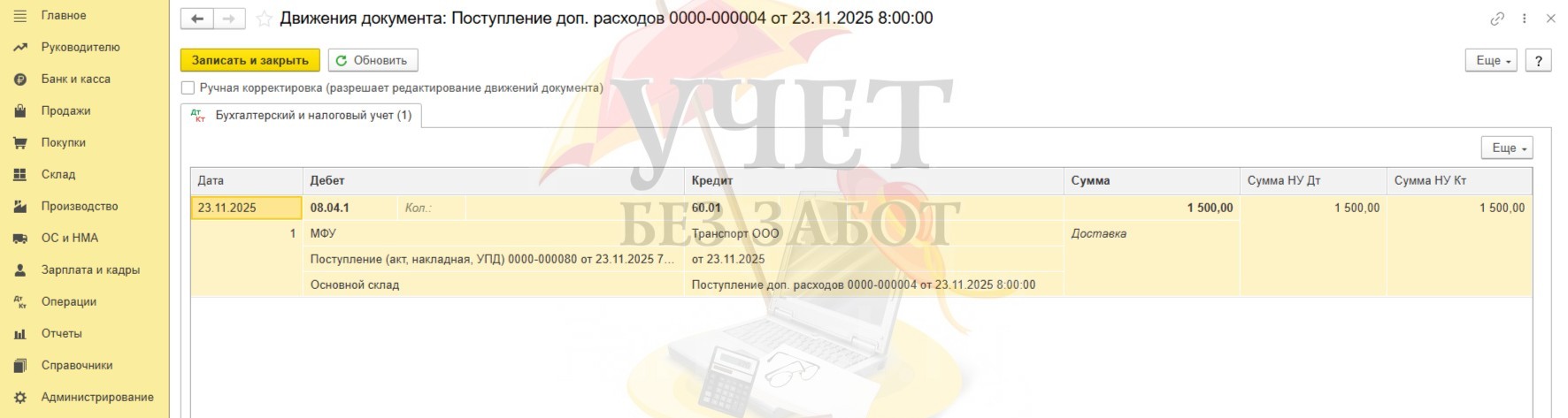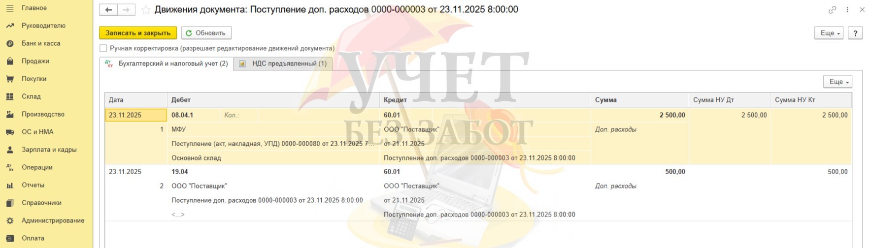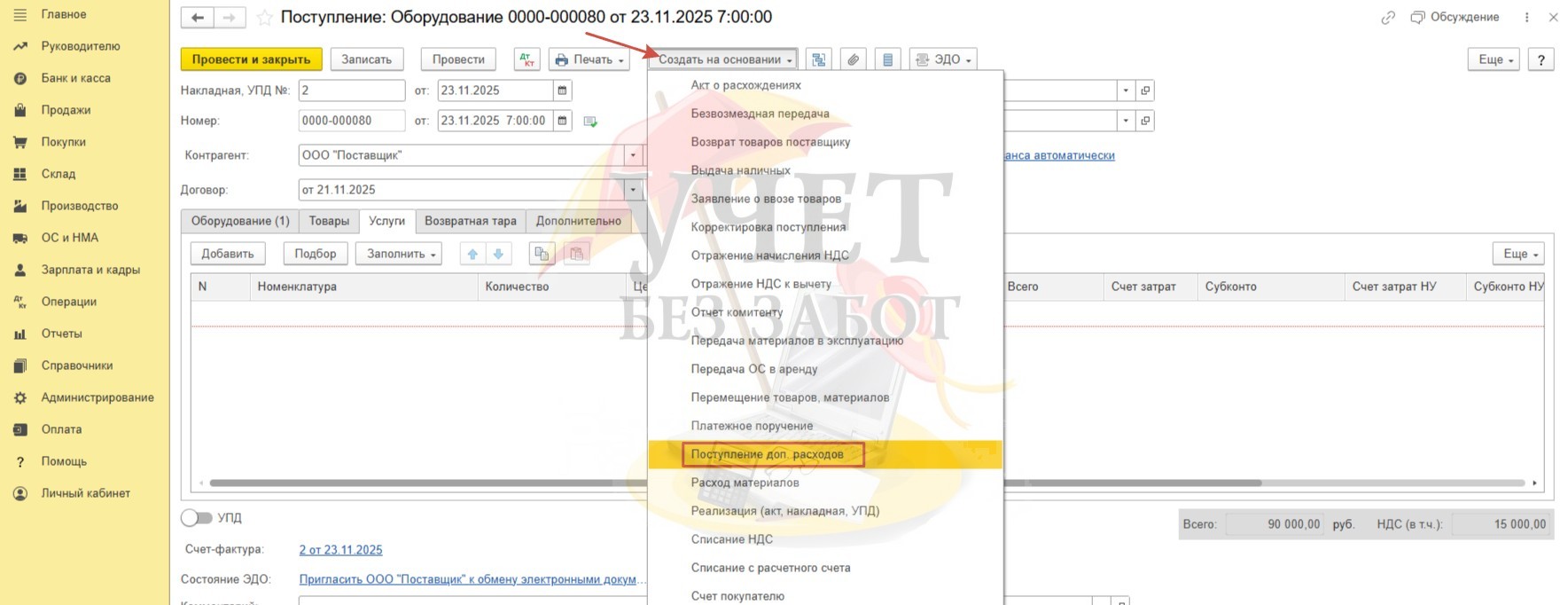 По кнопке «Создать на основании» создадим корректный документ «Поступление доп.расходов».