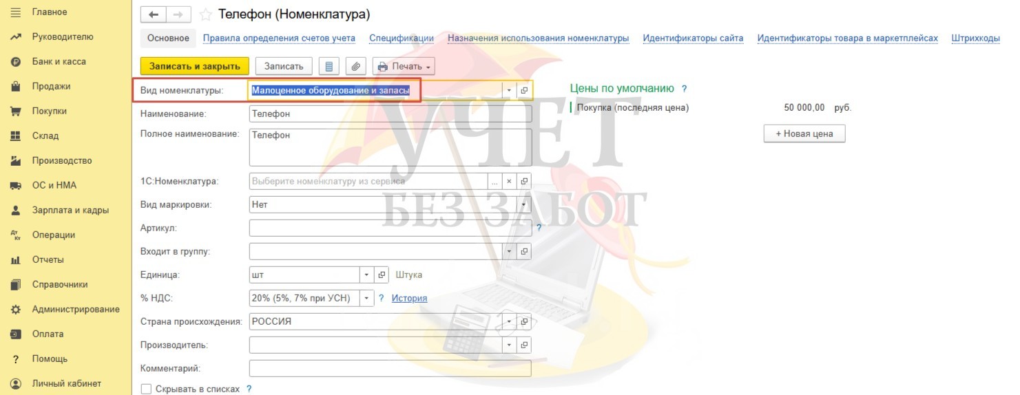 При создании номенклатурной единицы «Телефон» особое внимание необходимо обратить на вид номенклатуры - «Малоценное оборудование и запасы».