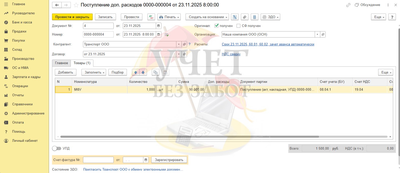 В нашем примере у МФУ есть такие дополнительные расходы как доставка и установка. Это значит, что нужно использовать более длинную цепочку документов: сначала документ «Поступление оборудования», потом «Поступление доп.расходов», и в конце «Принятие к учету ОС».