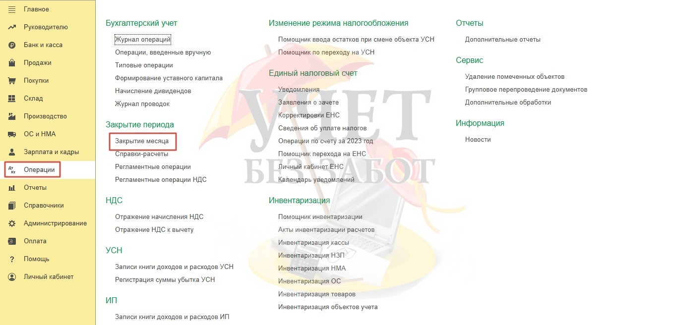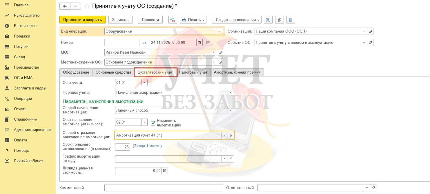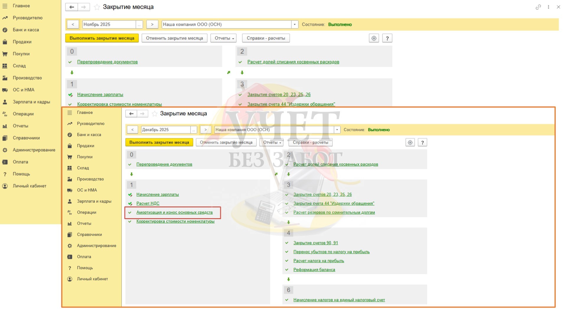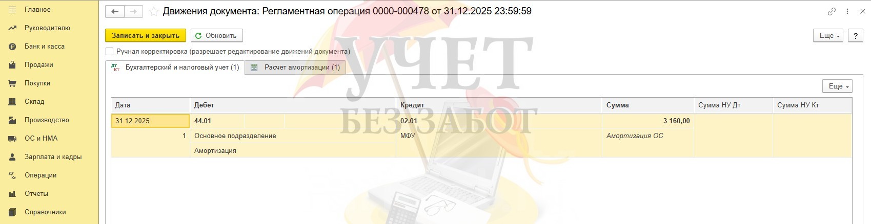 Амортизация в программе начисляется автоматически при «Закрытии месяца» в разделе «Операции», со следующего месяца после принятия основного средства к учету.