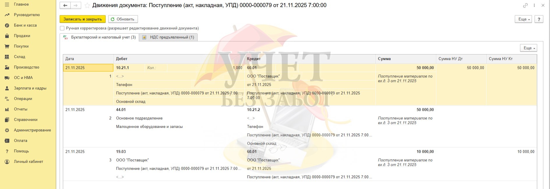 Д 10.21.1 К 60.01 Оприходован телефон по первоначальной стоимость 50 000 рублей (без НДС), стоимость отражена в БУ и в НУ.